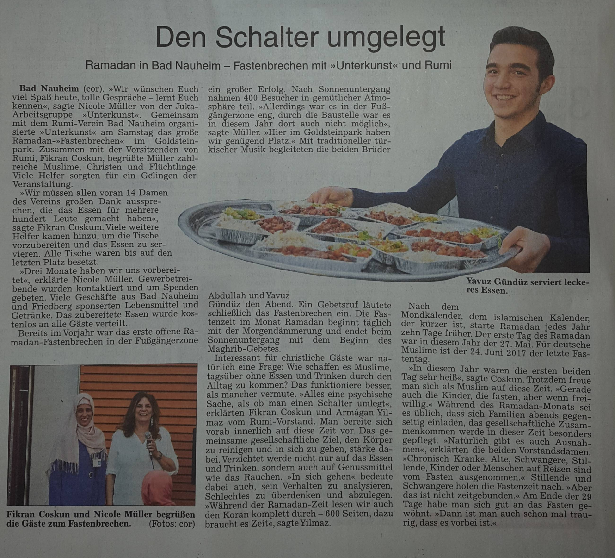 Gemeinsam mit dem Unterkunst-Verein organisierte der Rumi Kultur Verein am 10. Juni 2017 ein offenes Ramadan-Fastenbrechen im Goldsteinpark Bad Nauheim. Das erste offene Ramadan-Fastenbrechen letztes Jahr in der Fußgängerzone war ein großer Erfolg. Daher haben wir uns auch dieses Jahr mit dem Unterkunst-Verein zusammengesetzt. Allerdings war es in der Fußgängerzone eng und durch die Baustelle