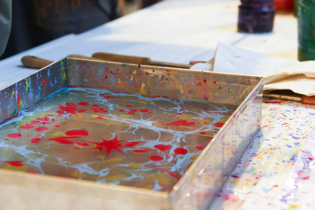 Künstlerische Angebote zum Mitmachen wie Ebru-Malerei (Malen auf dem Wasser), Kalligraphie sowie Encaustic, eine Maltechnik, bei der in Wachs gebundene Farbe mit Bügeleisen auf Papier aufgetragen wird, wurde an diesem Nachmittag angeboten. Die Besucher hatten Gelegenheit, diese besonderen künstlerischen Angebote auszuprobieren und selbst zu gestalten. Zur leiblichen Stärkung war selbstverständlich gesorgt – ein offenes Buffet mit köstlichen türkischen Spezialitäten.